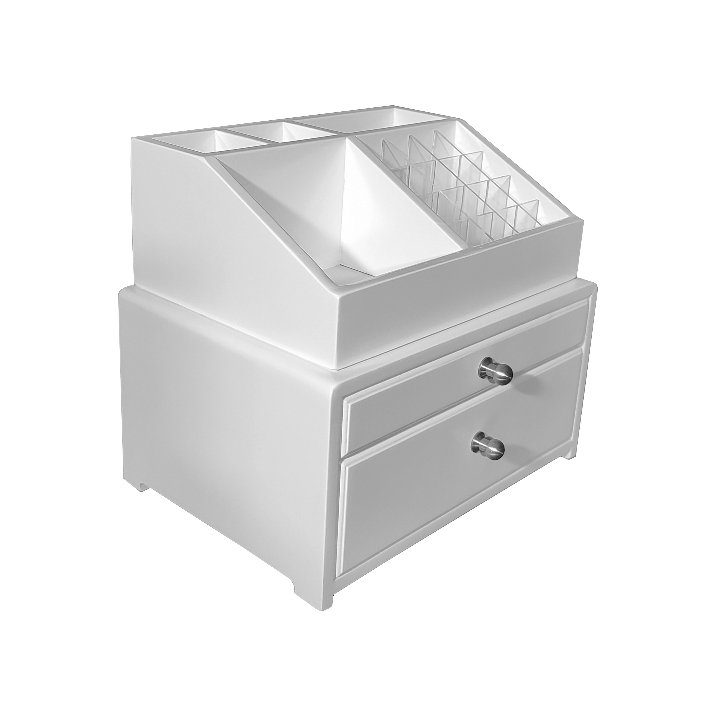 جعبه لوازم ارایش مدل مرجان دارای 2 بخش مجزا میباشد که از هم جدا هستند بخش اول که بالای جعبه قرار میگیرد از 16 خانه کوچک تشکیل شده که برای قرار دادن لوازم کوچک ارایشی و 4 خانه دیگر هم برای عطر و برس و غیر قسمت پاین جعبه هم دارای 2 کشو زیبا و کاربردی میباشد این جعبه ارایشی زیبا را میتوان در دو رنگ سفید و قهوه ای تیره سفارش داد